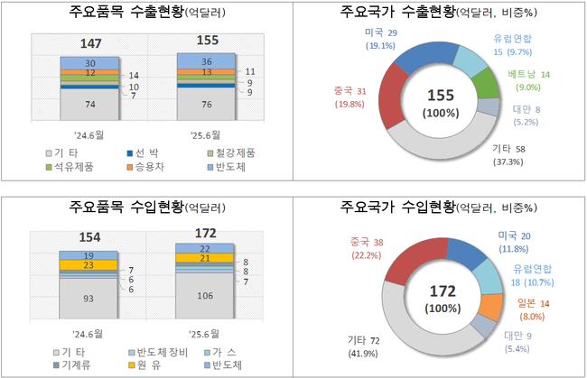 관세청은 11일, 6월 1일부터 10일까지의 수출입 잠정 통계에 따르면 수출은 155억 달러로 전년 동기 대비 5.4% 증가했으며, 수입은 172억 달러로 11.5% 늘어난 것으로 나타났다고 밝혔다. 무역수지는 17억 달러 적자를 기록했다.